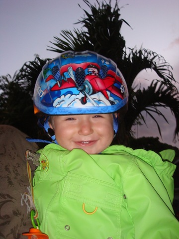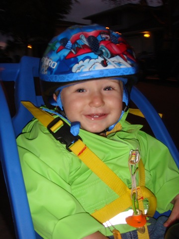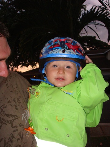 So today dad finally got his bicycle working again. He's been telling me that he would take me for a bike ride as soon as he got his bike working again. I can't wait until he gets home tomorrow to take me on a bike ride again. I hope we go further the next time. I like the feeling of the wind blowing through this strange "helmet" mommy put on my head.
